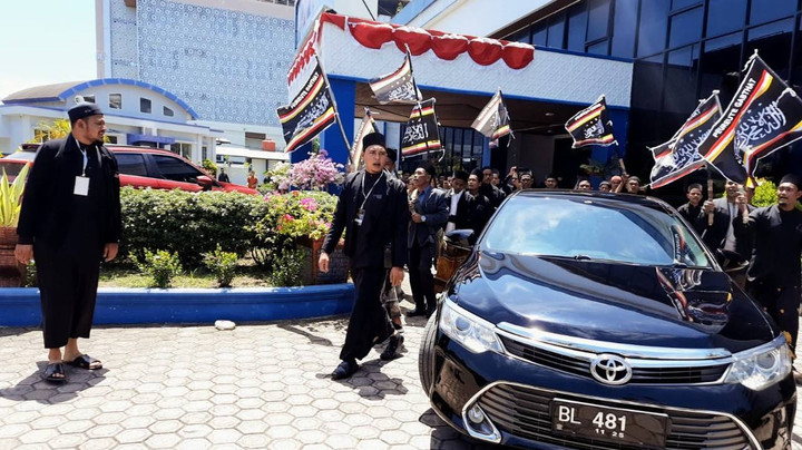 Pelantun bacaan suci umat Islam itu puluhan pria serba hitam. Kelir baju, kain sarung atau celana serba gelap. Bendera berlatar hitam dikibarkan. Sisi atas dan bawah bendera terdapat tiga garis warna merah, putih, dan kuning. Di tengahnya kalimat tauhid diapit lima bintang di atas dan satu di bawah.