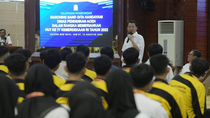 Gubernur Aceh, Mayjen (Purn) TNI Achmad Marzuki, melepas keberangkatan Marching Band Gita Handayani binaan Dinas Pendidikan Aceh, ke Jakarta, Jumat (12/8/2022). Mereka nantinya akan tampil di Istana Negara memeriahkan perayaan Hari Ulang Tahun (HUT) ke-77 Kemerdekaan Republik Indonesia.