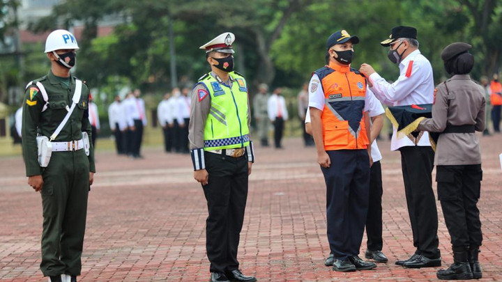 Gubernur Aceh, Nova Iriansyah, menjadi inspektur dalam apel gelar pasukan Operasi Ketupat 2021, di Lapangan Mapolda Aceh, Rabu, (5/5/2021). Apel yang digelar serentak di seluruh Indonesia itu, bertujuan untuk mengecek kesiapan akhir pelaksanaan Operasi Ketupat 2021 dalam rangka pengamanan hari raya Idul Fitri 1442 H dan menegakkan kebijakan larangan mudik.