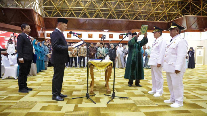 Penjabat (Pj) Gubernur Aceh, Achmad Marzuki melantik Amiruddin sebagai Pj Wali Kota Banda Aceh dan Mahyuzar sebagai Pj Bupati Aceh Utara. Pelantikan berlangsung di Anjong Mon Mata, Banda Aceh, Jumat sore (14/7/2023).