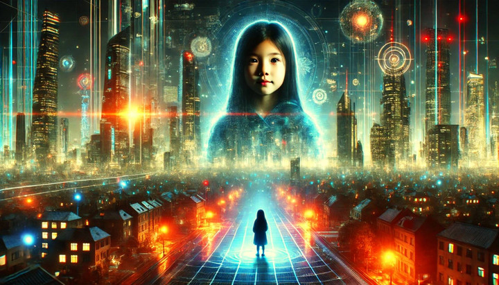 Aku berbalik perlahan. Di sana, di bawah cahaya hologram kota yang temaram, berdiri seorang gadis mungil dengan rambut hitam panjang. Wajahnya... wajah yang sama persis seperti yang kuingat di hari perpisahan kami selepas SD.