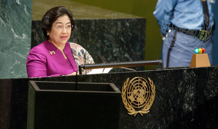 Perjuangan Megawati Soekarnoputri, Presiden Republik Indonesia Ke-5 dalam Sidang Umum PBB tahun 2003, membawa isu koeksistensi damai dan solidaritas Palestina.Aji Cahyono