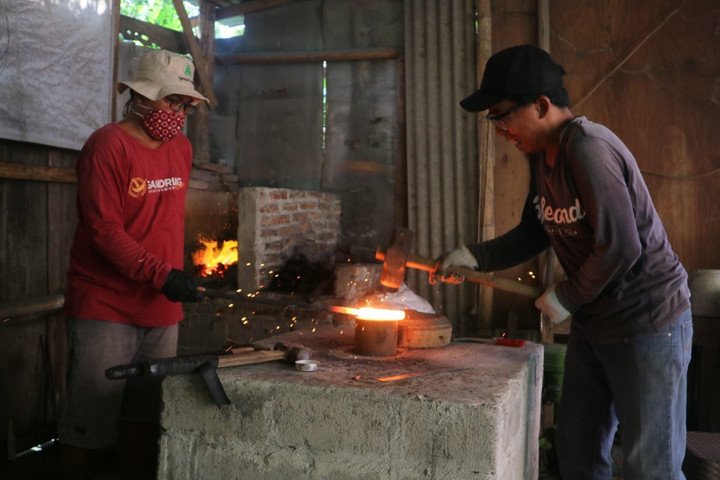 Di lereng Gunung Mojo, Banyusurup, Girirejo, Imogiri, Pak Darsono dan Pak Daryanto menempa keris hias di Besalen Gunung Mojo.Alif Rasyada Ikhsan