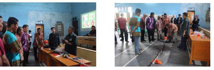 Setelah praktik merakit komponen mesin penyiang gulma, dilanjutkan praktik penggunaan secara langsung di lahan sawah. Respon petani yang mencoba mesin penyiang gulma cukup baik, mesin mudah dioperasikan dan hasilnya sangat baik.