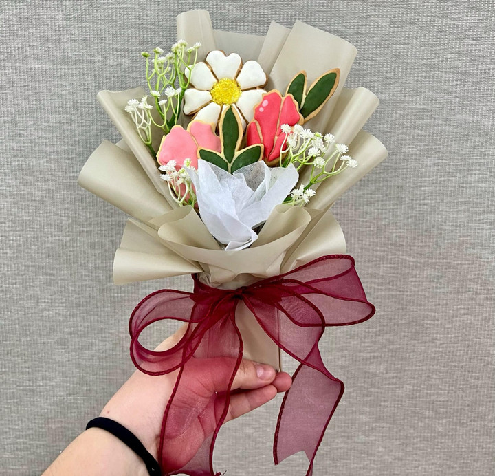 Tak ketinggalan, tersedia juga pernak pernik hiasan seperti pita, stirofoam, dan plastik untuk semakin mempercantik flower cookies hingga nantinya menjadi sebuah buket.