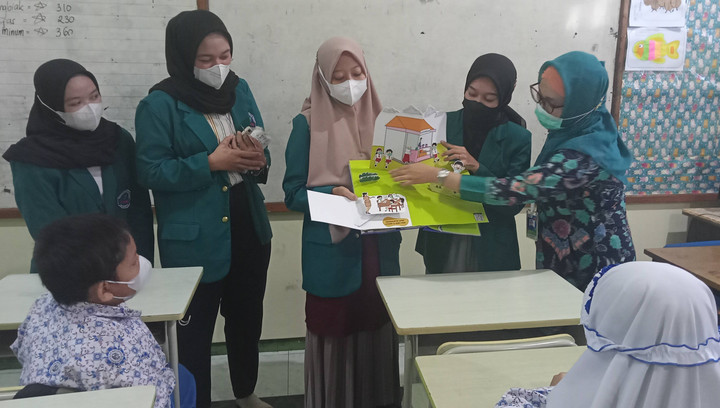 Mereka masuk kelas untuk mengajar dan memberikan tutorial kepada siswa untuk penggunaan Pop Up Book.