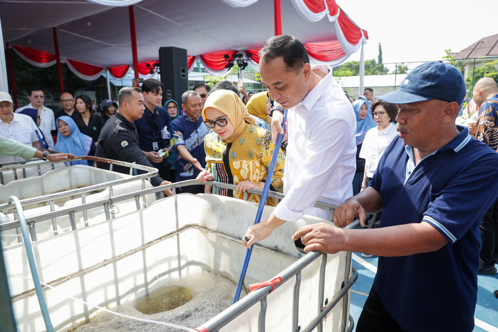 Wali Kota Surabaya Eri Cahyadi dan Ketua Tim Penggerak PKK Kota Surabaya Indriyani turut hadir dalam prosesi panen perdana ini.