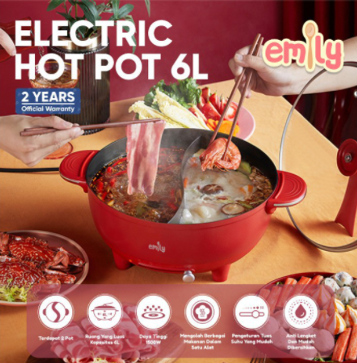 Emily Electric Hot Pot. Untuk Anda yang suka hidangan berkuah hangat, EMily Electric Hot Pot sedang diskon menjadi Rp 662.997. Kelebihan dari produk ini adalah bisa memasak dua menu berbeda dalam 1 panci. Untuk harga yang relatif terjangkau, kapasitas Emily Electric Hot Pot sebesar 6 liter dan cukup untuk 4 hingga 10 porsi. Sangat cocok untuk perjamuan besar.