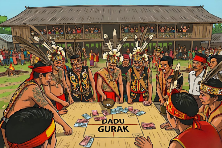 [4] Dadu gurak: Istilah lokal, umum digunakan di wilayah Kalimantan Tengah dan sekitarnya, untuk menyebut jenis permainan judi yang menggunakan dadu.