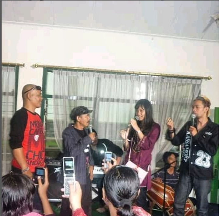 Ini foto pertama kali saya jadi seorang pembawa acara di panggung nikahan keluarga. Kebetulan, salah satu komedian diundang oleh pihak penyelenggara yaitu Ki Daus (partner Rina Nose) beserta rekannya untuk memeriahkan acara. Masih berkesan di ingatan, saya yang baru selesai makan bistik sapi & nasi, tiba-tiba dipanggil Ayah untuk naik ke panggung untuk duet maut jadi MC. Karena, kepalang tanggung sudah dipanggil dan lari juga bukan solusi. Akhirnya, dengan langkah gontai dan terseok-seok sambil jantung berdebar dan tangan keringat dingin, saya berhasil berada di atas panggung.