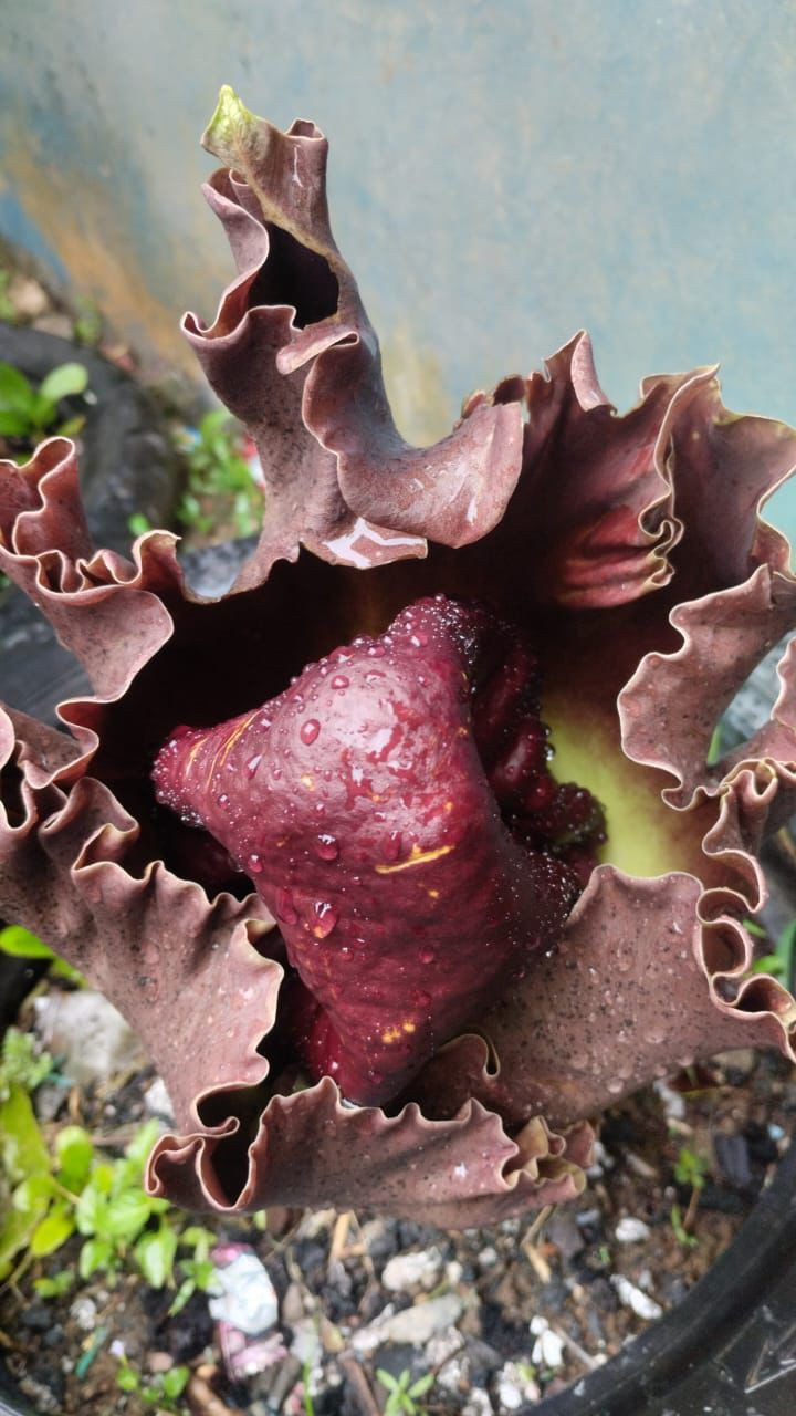 Yuliana selaku pemilik rumah juga menyampaikan bahwa dirinya sempat memotong tunas bunga keladi luak itu. Ketika bunga bangkai raksasa tersebut mekar, bau tak sedap dan kerumunan lalat timbul hingga sempat menjadi tontotan warga sekitar yang melintas di depan rumah Yuliana.