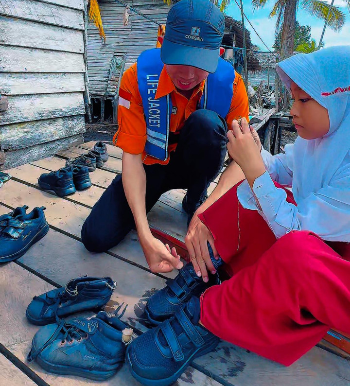 "Cika, Sabrina dan teman-teman nya, hari ini kami antarkan sepatu, sepatu yang lama koyak bahkan ada yang bolong tapaknya, begitu bahagia melihatnya. Doakan sepatu ini akan terus menembus pedalaman kalbar, sepatu untuk anak anak hebat yang tak pernah lelah untuk menimba ilmu," tambahnya.
