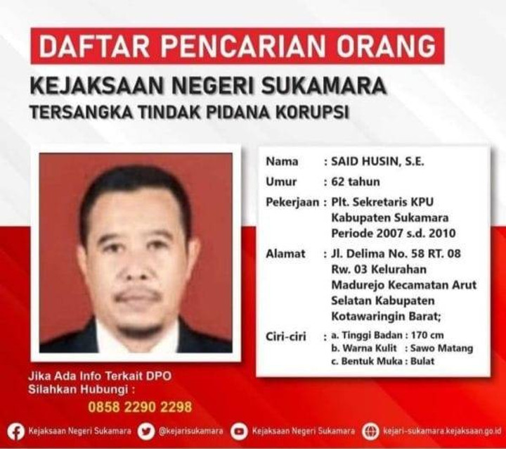 SUKAMARA-Said Husin, mantan Plt Sekretaris Komisi Pemilihan Umum (KPU) Kabupaten Sukamara periode 2007-2010 masuk dalam daftar pencarian orang (DPO). Penetapan Said sebagai DPO dilakukan oleh Kejaksaan Negeri (Kejari) Sukamara setelah dirinya menjadi tersangka kasus korupsi sisa dana hibah pada Pilkada tahun 2008 lalu.