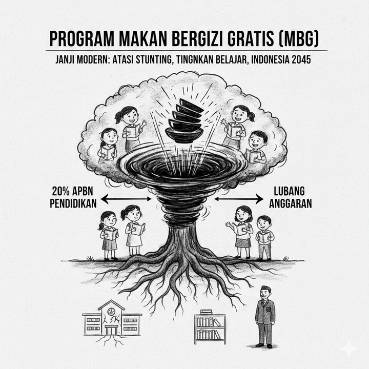 Program Makan Bergizi Gratis (MBG) hadir sebagai janji modern: menekan stunting, meningkatkan konsentrasi belajar, dan mengantar Indonesia menuju 2045 dengan dada tegap. Dalam pidato, program ini terdengar pahlawan; dalam brosur, tampil seperti hadiah negara bagi anak-anak. Namun, anggaran yang menyokongnya sebagian besar diambil dari pos pendidikan—sebuah lubang kecil yang kini mulai terasa seperti jurang. Secara nominal, porsi 20 persen APBN untuk pendidikan tetap terpenuhi, tetapi setelah dikurangi program makan, sisa untuk peningkatan kualitas sekolah menyempit drastis. Renovasi gedung tertunda, pelatihan guru dipangkas, perpustakaan sepi buku baru. Pohon pendidikan tetap terlihat kokoh, tapi akarnya perlahan disedot.