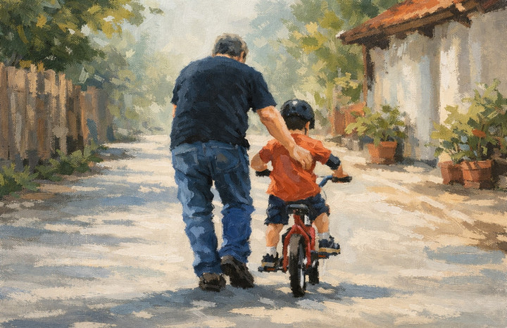Itu pertama kali Ayah mengajariku mengendarai sepeda motor. Ayah, aku ingat betul, saat itu aku takut setengah mati. Tapi ayah meyakinkanku, dan dengan santai Ayah bilang, “Gak apa-apa, ada Ayah di belakang.”