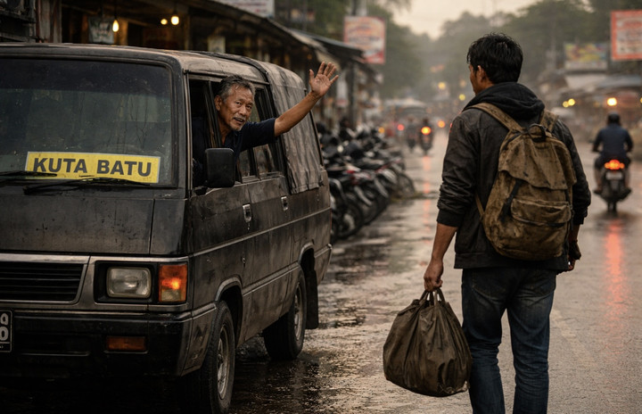 “Setidaknya ada satu penumpang saja untuk ongkos minyak, mobil ini akan langsung berangkat.” gumamnya sambil bersandar di bagian belakang mobil L300 tua miliknya.