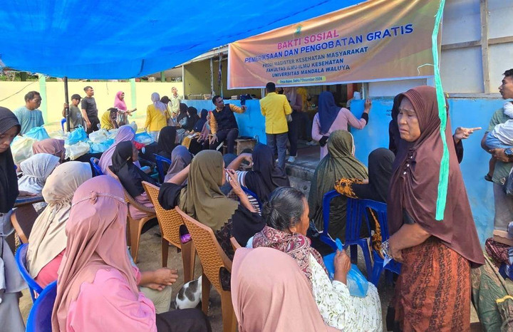 Mahasiswa Program studi magister Kesehatan Masyarakat, Fakultas Ilmu Kesehatan, Universitas Mandala Waluya (UMW) Kendari memberikan layanan kesehatan kepada warga pesisir pantai Desa Bajoe, Kecamatan Soropia, Kabupaten Konawe, pada Sabtu (7/12). Kegiatan itu merupakan agenda bakti sosial (baksos) kesehatan dan mata kuliah prodi kampus.