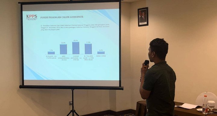 "Paslon LA-Ida unggul 32,5 persen. Disusul Tina-Ihsan dengan angka 27,3 persen. Kemudian ASR-Hugua 26,4 persen. Lalu terakhir Ruksamin-Sjafei Kahar 7,2 persen. Sisanya 6,6 persen swing voter atau yang belum menentukan pilihan," kata Manager Riset KPPS, Ali Said.