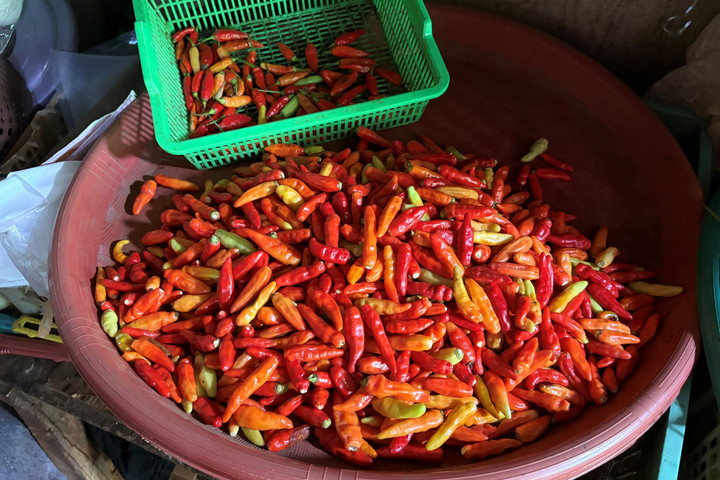 โCabe saya jual sama semua, tapi naik juga dari kemaren. Ini cabai rawit, merah, keriting, Rp 100.000,โ tutur Mario.