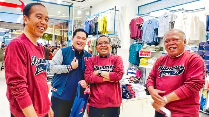 Dalam unggahan instagram Menteri BUMN Erick Thohir, tampak Jokowi, Menteri PUPR Basuki Hadimuljono hingga Mensesneg Pratikno, mengenakan kaus yang sama, merek Hammer warna merah marun.