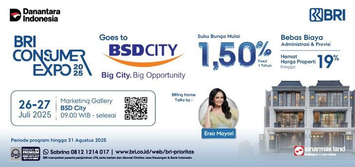 Kunjungi Marketing Gallery BSD City pada 26โ27 Juli 2025 dan rasakan sendiri pengalaman beli rumah yang berbeda. Ajukan KPR lebih praktis di Homespot.id atau kunjungi bbri.id/exposml untuk info lengkapnya.