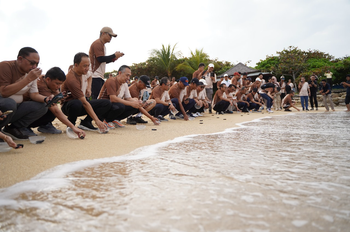 Finnet sebagai anak perusahaan Telkom melakukan pelepasan 100 ekor tukik di Pantai Nusa Dua, Bali sebagai komitmen Environmental, Social, and Governance (ESG).kumparanBISNIS
