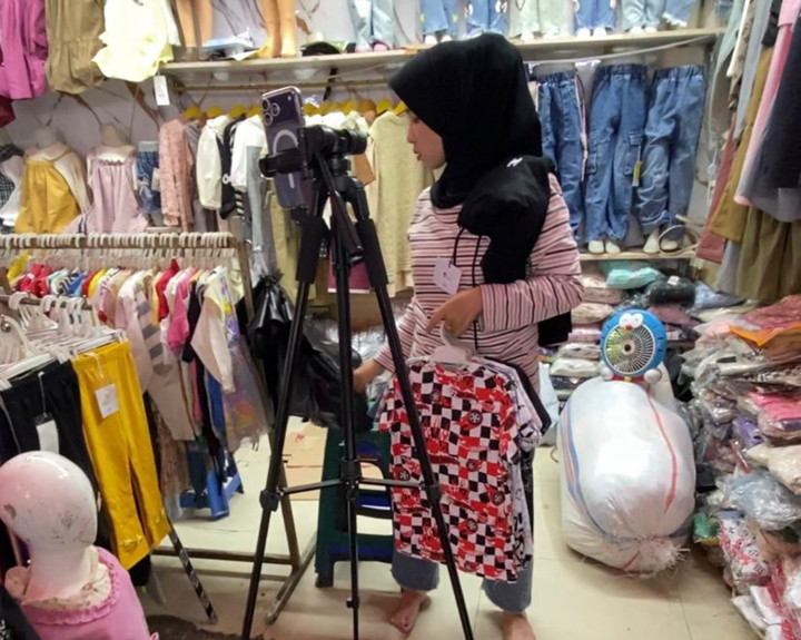 Model bisnis hibrida ini terlihat di Blok B Pasar Tanah Abang. Salah satunya dilakukan Darmanto, penjual hijab yang rutin melakukan siaran langsung melalui TikTok.