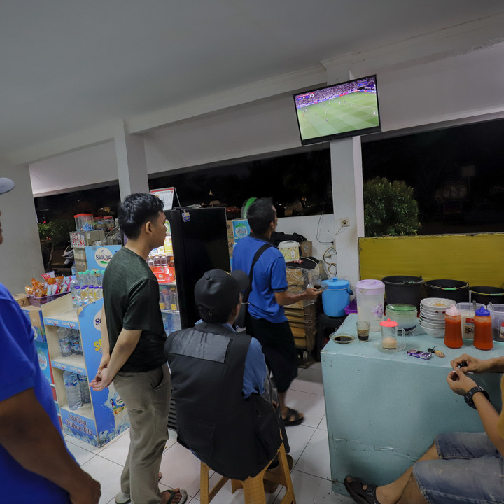 Pecinta sepak bola Indonesia menyaksikan pertandingan antara Indonesia melawan Jepang dalam laga lanjutan Kualifikasi Piala Dunia 2026 pada layar televisi di pasar Pasar Minggu, Selasa (10/6/2025).