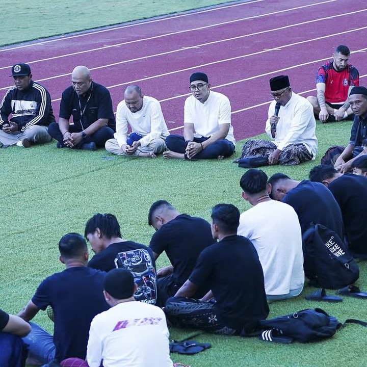 Arema FC bersama pemain, ofisial hingga manajemen dan perwakilan Aremania melakukan doa bersama di Stadion Kanjuruhan, Kamis (26/6/2025).kumparanBOLA