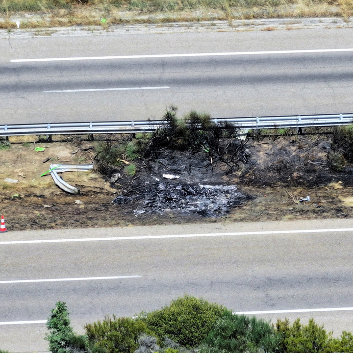Pohon-pohon dan rumput di pinggir jalan juga terlihat gosong dan terdapat pula sisa-sisa kebakaran dari kendaraan yang dikendarai Jota.