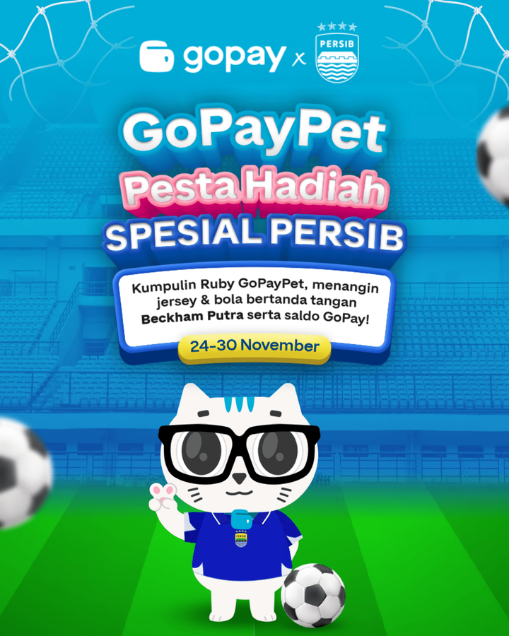 Kabar gembira untuk Bobotoh! GoPay menghadirkan program “GoPay Pet: Pesta Hadiah Spesial PERSIB” yang memungkinkan pengguna bermain game interaktif dan berkesempatan membawa pulang hadiah eksklusif Persib. Berlangsung mulai 24-30 November 2025, pemain bisa mendapatkan hadiah spesial berupa jersey dan bola bertanda tangan pemain muda andalan Maung Bandung, Beckham Putra.