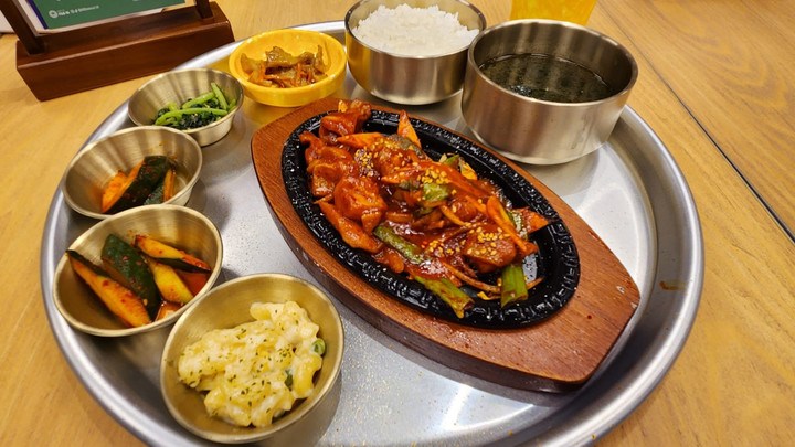Menikmati ayam dengan saus khas Korea ini semakin lengkap karena ada deretan banchan seperti kimchi kubis dan mentimun, gaji bokkeum (tumisan odeng), macaroni salad, sampai salad bayam. Kemudian, terdapat juga semangkuk nasi hangat dan sup rumput laut khas Korea yang gurih.
