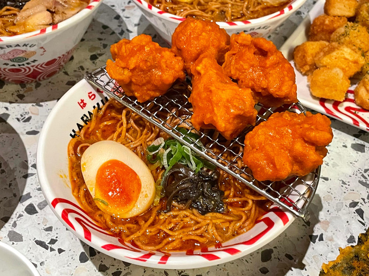 Topping spicy chicken karaage juga menjadi pelengkap yang menarik. Potongan ayamnya terasa lembut dan juicy serta dilapisi dengan saus pedas khas Haraku Ramen. Rasa pedasnya tidak terlalu mendominasi, namun justru malah melengkapi cita rasa keseluruhan menu ini. Tekstur ayam yang lembut di dalam menyatu dengan mi tipis yang kenyal serta kuah pedas yang menggugah selera. Kombinasi ini memberikan pengalaman menikmati ramen pedas yang seimbang dan memuaskan.