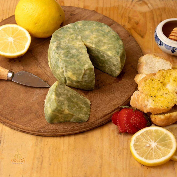 Proses formulasi spirulina menghasilkan warna hijau dan membuat tekstur khas pada kejunya.