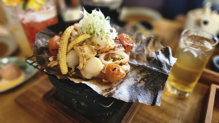 Aroma daun kering khas yang terbakar oleh arang, membuat rasa aneka seafood yang terdiri dari potongan cumi, udang, dan scallop, terasa lebih harum nan smoky. Kemudian rasa seafood yang cenderung plain, diperkaya dengan saus miso gurih bercampur cacahan kacang.