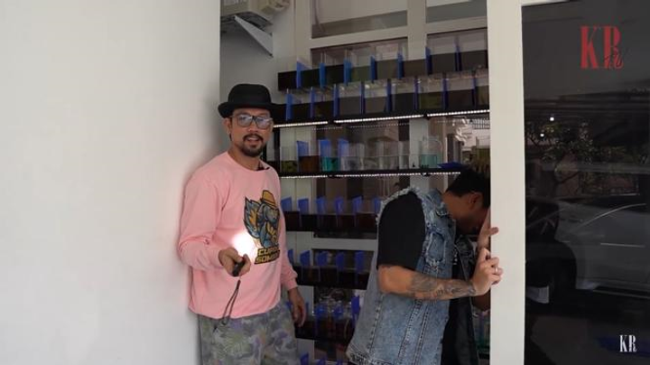 Denny Sumargo memiliki rak besar di depan rumah. Rak tersebut berisikan deretan koleksi ikan cupang peliharaannya.