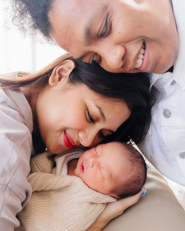 Dalam salah satu foto, Indah tampak tengah menggendong Naka sembari tersenyum. Tampak pula sang suami, Arie Kriting, yang tersenyum sambil memandangi wajah putranya.