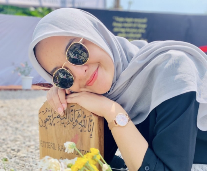 Melalui unggahan di Instagram Story, Nabila membagikan foto sedang memegang dan menyandarkan kepala ke nisan kayu di makam Eril.