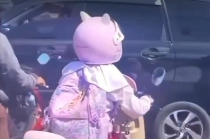 Dalam video, anak perempuan tersebut berseragam merah-putih, menggendong tas, serta memakai helm warna ungu beraksen telinga kucing. Dia menyeberang jalan dengan sepeda listriknya di jalan raya tanpa ada yang mendampingi.