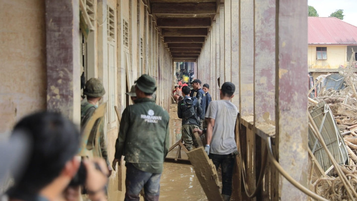 Pembersihan di Ponpes Darul Mukhlisin Aceh Tamiang terus dikebut tanpa henti sejak malam hingga dini hari.