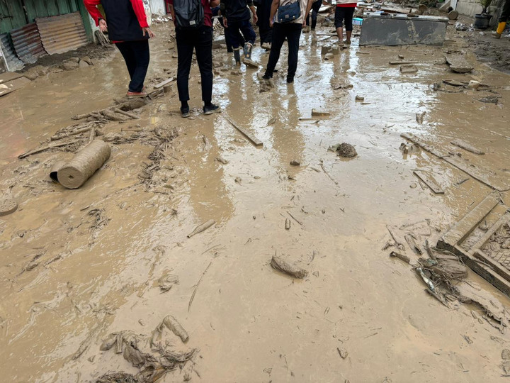 Selain lumpur yang menghalangi, tampak ada atap rumah warga yang terbawa arus banjir. Atap itu melintang di tengah jalanan di atas lumpur.
