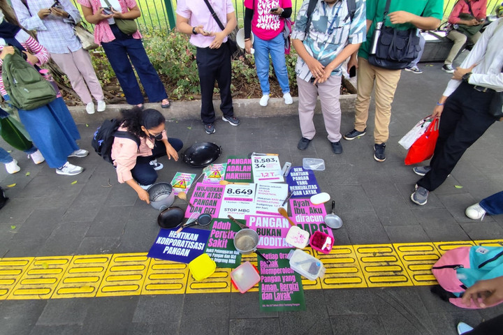 Salah seorang peserta aksi dari Koalisi Perlindungan Kesehatan Masyarakat, Yuli Supriati, menilai program MBG mesti dievaluasi. Sebab, pelaksanaan program itu dinilai terlalu terburu-buru sehingga belum berkeadilan.