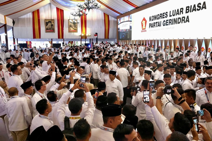 Ribuan kader Partai Gerindra berebut bersentuhan langsung dengan Presiden Prabowo Subianto. Saat dihampiri, mereka yang berada di bawah panggung berusaha dengan antusias menyalami Presiden Prabowo yang baru saja kembali dikukuhkan sebagai Ketua Umum dan Ketua Dewan Pembina Partai Gerindra.