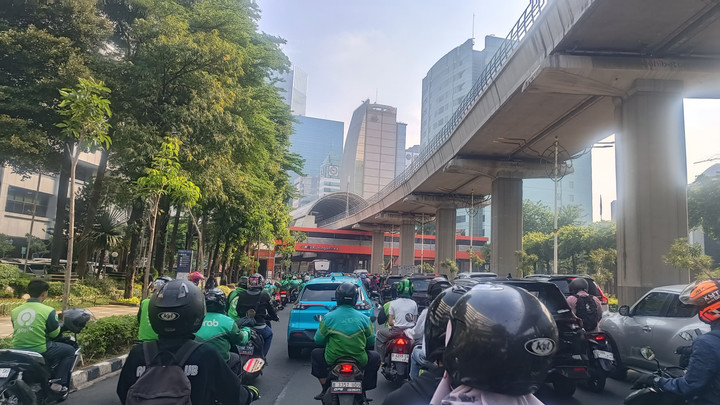 Pantauan di kawasan Mampang Prapatan, pertigaan Kuningan dan Gatot Subroto hingga Senayan menunjukkan arus lalu lintas yang padat.
