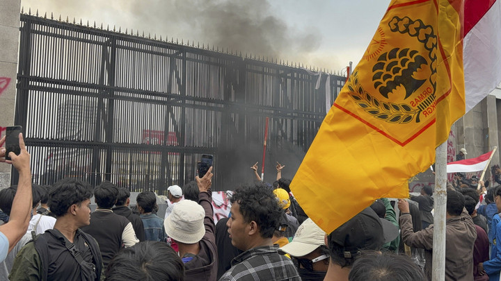 Beberapa di antara mereka mulai menaiki pagar gedung DPR dan melakukan aksi vandalisme.