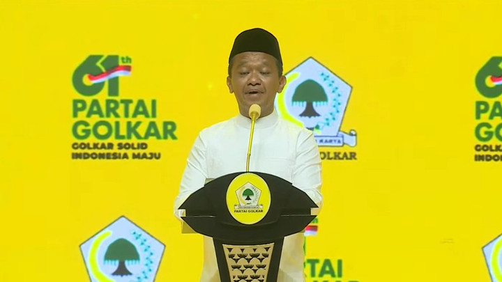 Ketua Umum Partai Golkar Bahlil Lahadalia menyampaikan pidato politiknya di acara HUT ke-61 Golkar. Dalam acara itu, Presiden Prabowo Subianto juga turut hadir.