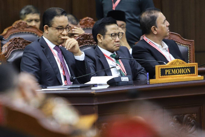 Sementara ekspresi Anies-Muhaimin ketika gugatan mereka ditolak MK, hanya duduk diam. Sedangkan kuasa hukum mereka, Bambang Widjojanto terlihat sempat sibuk mengetik dan Refly Harun memegang dahinya menggunakan tangannya.