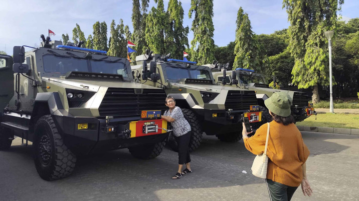 โNemenin anak aja ini lihat-lihat ini (kendaraan tempur). Ya anak seneng sih tadi foto-foto naik juga,โ ujarnya.