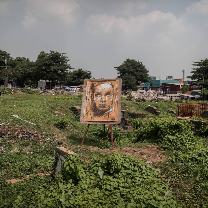Sejumlah karya lukisan terpajang di kawasan pemukiman warga pengumpul rongsokan dan pemakaman Menteng Pulo, Jakarta, Kamis (14/12).kumparanNEWS