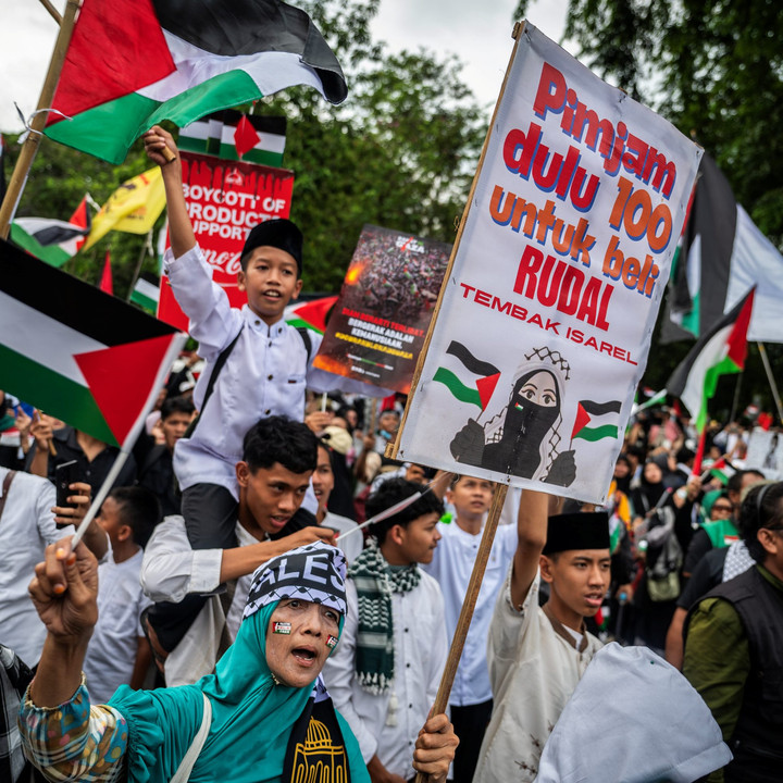 Aksi bela Palestina kembali digelar di Jakarta. Aksi bertajuk 'Dobrak Blokade, Stop Genosida Gaza' digelar di depan Kedutaan Besar (Kedubes) Amerika Serikat di kawasan Gambir pada Selasa (7/10).